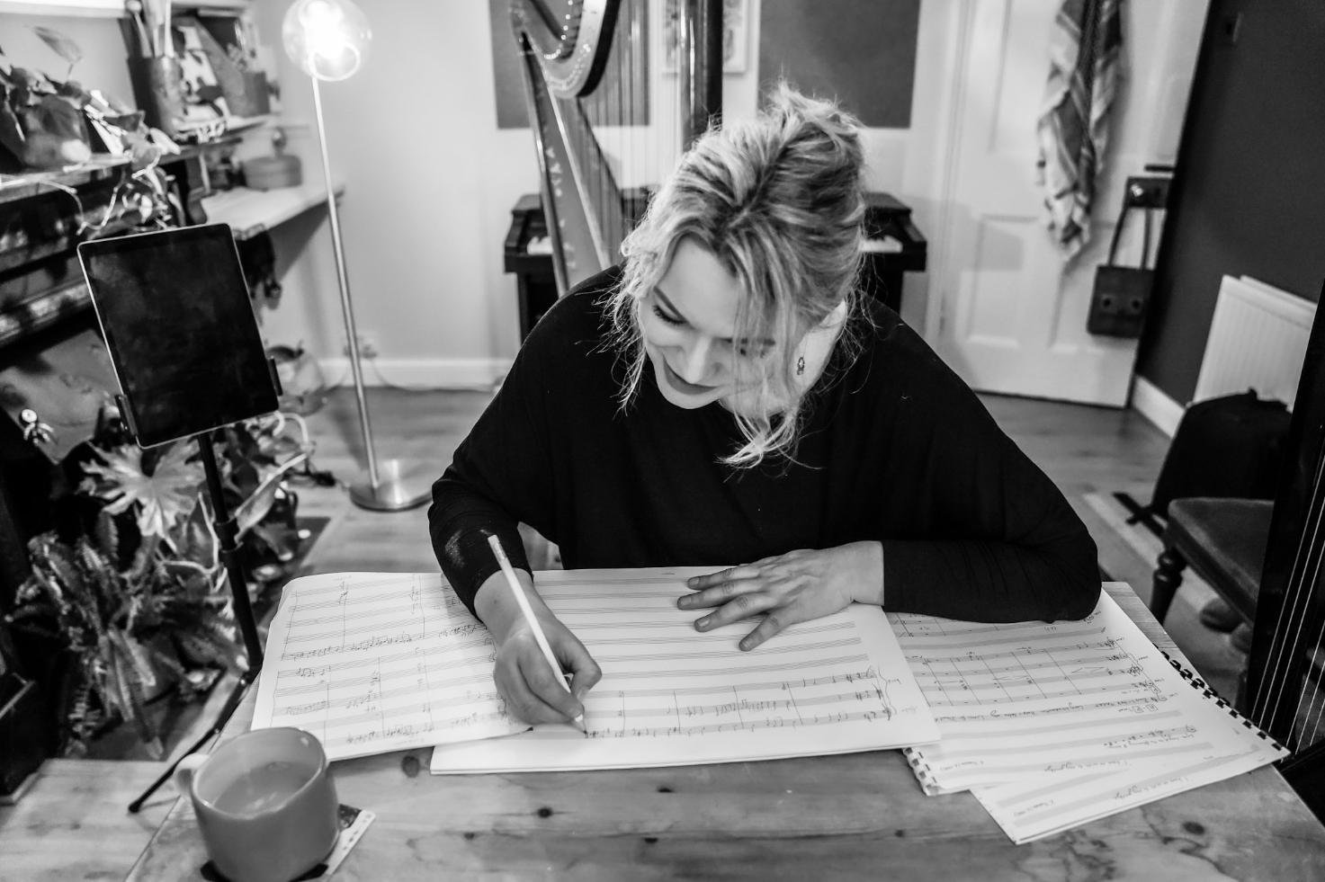 Eleanor's current works-in-progress include a set of Scottish tunes (she is Scottish) called the Caurnie Set, which is a work in progress, inspired by the 100-year-old craft of soap-making using nettles and other fresh plants and herbs, which is still thriving at the Caurnie soaperie. She is also working on an electronic soundscape and experimenting with synths. She is looking for funding to embark on a large scale solo acoustic harp composition...for now, she is gathering ideas!