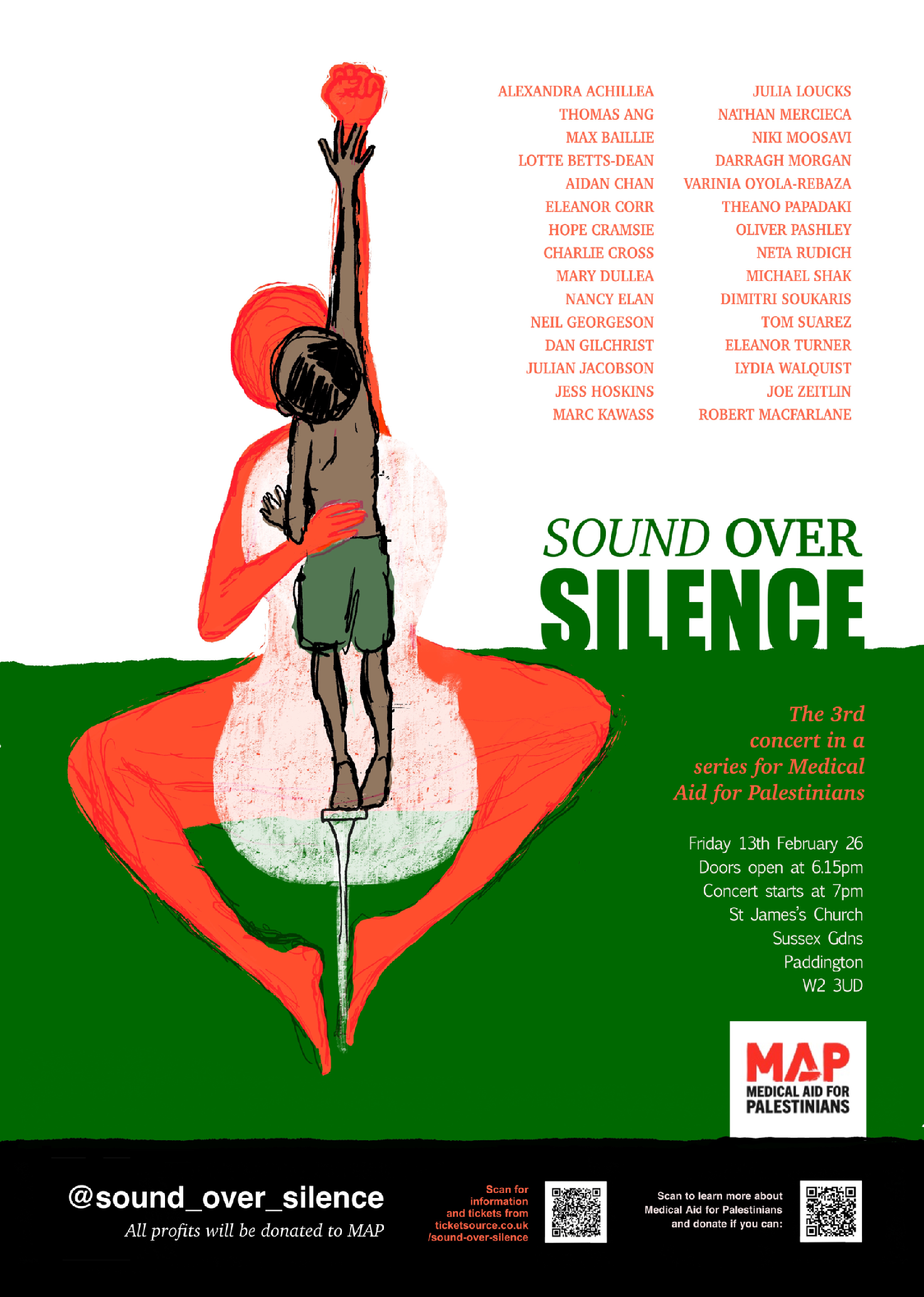 February 13th Palestine fundraiser at St. James, Paddington, London for Sound Over Silence. Eleanor will perform with Eleanor Corr, violin, and a wider ensemble. £25 via Ticket Source: Sound Over Silence at St James Paddington event tickets from TicketSource