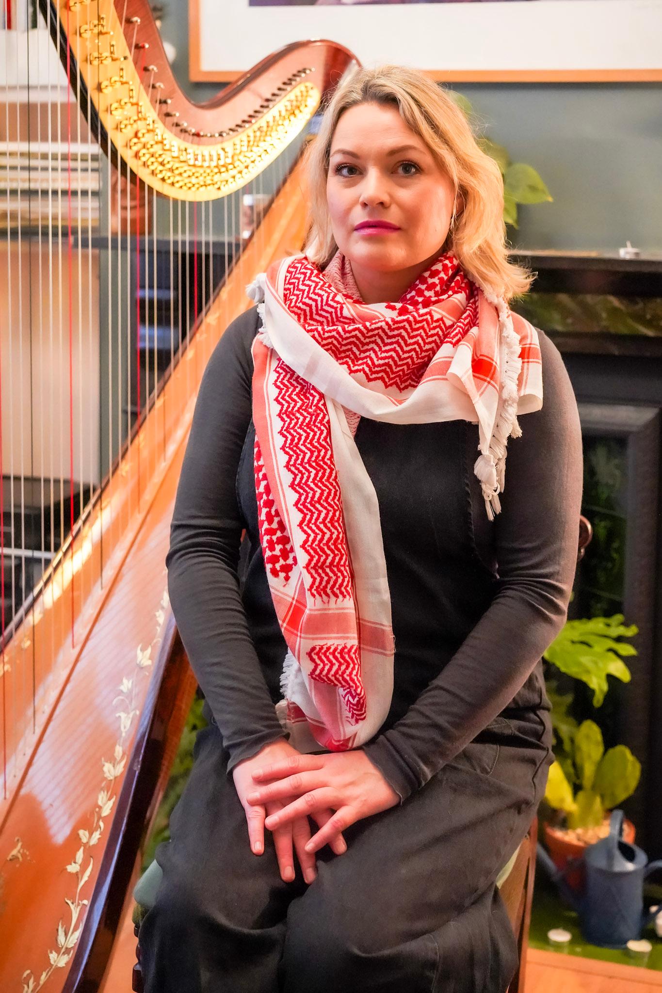 Photo below is of Eleanor Turner, wearing the keffiyeh, photographed in her home by Lucy Glen.