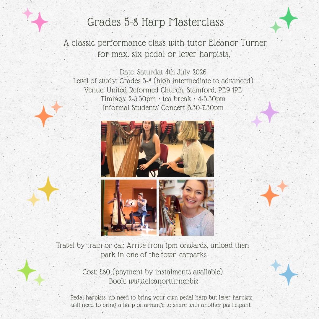Eleanor's Beginner Harp Course is currently fully booked but there will be new spaces available in July. Please email Eleanor: info@eleanorturner.com if you'd like to be the first to hear about the next opportunity to take 6 beginner lessons with Eleanor, with harp hire included. The first lesson must be in person at Eleanor's studio in Stamford, but subsequent lessons can be online.