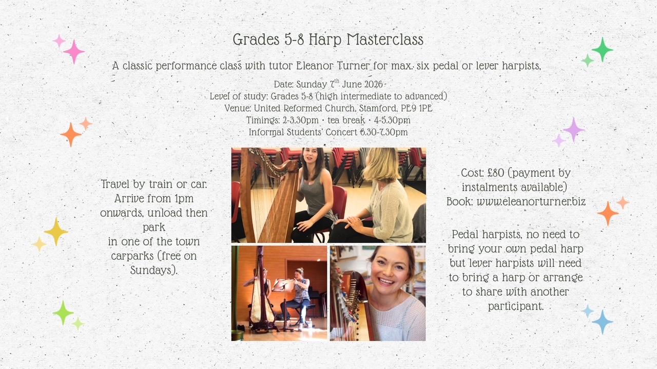 ONE PLACE AVAILABLE: Eleanor's Beginner Harp Course is open for new students: £180 for 6 half hour lessons INCLUDING harp hire. Price goes up in July so book in now! Please email Eleanor: info@eleanorturner.com The first lesson must be in person at Eleanor's studio in Stamford, but subsequent lessons can be online.